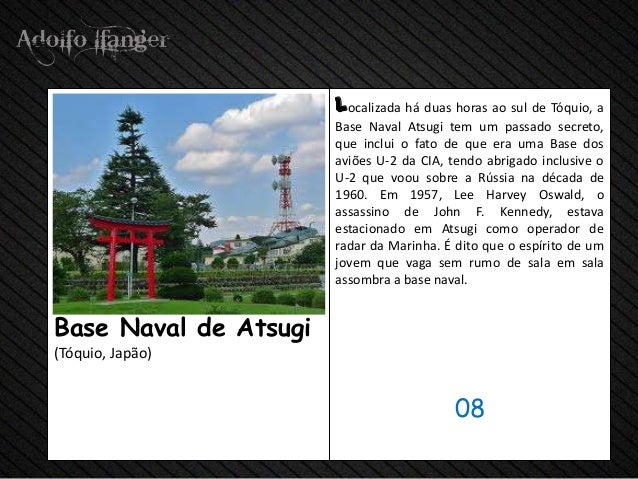 - 10. localizada há Duas horas ao Sul de Tóquio, a Base Naval Atsugi TEM UM Passado secreto, Que inclui o Fato de época that Uma Base de Dados dos Aviões U-2 da CIA, tendão abrigado inclusive o U-2 Que voou Sobre a Rússia na DÉCADA DE 1960. Em 1957, Lee Harvey Oswald, o assassino de John F. Kennedy, estava estacionado em Atsugi Como Operador de radar da Marinha. E Dito Que o Espírito de hum Jovem that vaga sem rumo de sala em sala assombra uma base naval.Base Naval de Atsugi (Tóquio, Japão) 08