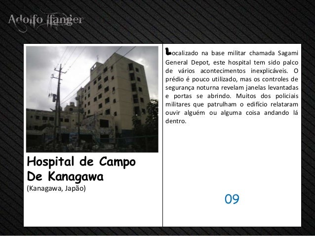 - 11. LOCALIZADO na base de Sagami militar Chamada Geral Depot, este hospital de TEM Sido palco de acontecimentos inexplicáveis Vários. O Prédio E Pouco Utilizado, mas OS Controles de Segurança noturna revelam Janelas e Portas levantadas se Abrindo. Muitos dos Policiais Militares that patrulham o Edifício relataram Ouvir Alguém OU Alguma Coisa Andando Lá dentro.Hospital de CampoDe Kanagawa (Kanagawa, Japão) 09