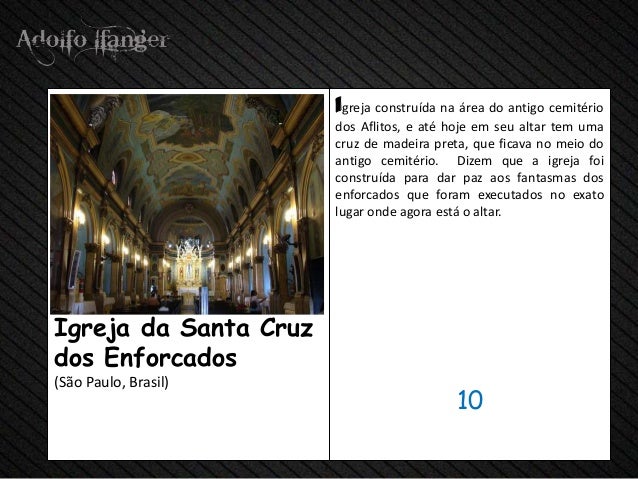 - 12. Igreja construida na área do Antigo Cemitério dos Aflitos, e Até Hoje em Seu altar TEM Uma cruz de madeira preta, Que ficava No Meio do Antigo Cemitério. Dizem Que a Igreja foi construida parágrafo dar paz AOS fantasmas dos enforcados that were executados sem Exato lugar Onde ágora ESTÁ o altar.Igreja da Santa Cruzdos Enforcados (São Paulo, Brasil) 10