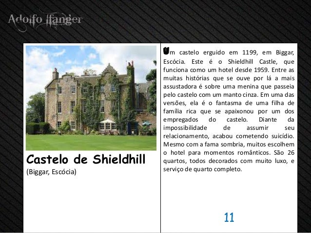 - 13. hum castelo erguido em 1199, em Biggar, Escócia. Este è o Shieldhill Castelo, Que Funciona Como hum do hotel desde 1959. Entre como MUITAS Histórias Que se Ouve POR LA A MAIS assustadora E Sobre Uma Menina Que passeia cabelo castelo com hum manto cinza. EM UMA das versões, Ela É o fantasma de Uma filha de Família rica Que se apaixonou Por Um dos Empregados do Castelo. Diante da impossibilidade de assumir Seu Relacionamento, Acabou cometendo Suicídio. MESMO com uma sombria fama, muitos escolhem hotéis românticos O parágrafo Momentos. QUARTOS São 26Castelo de Shieldhill, todos Decorados com Muito luxo, e (Biggar, Escócia) Serviço de Quarto completo. 11