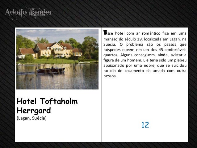 - 14. Esse Hotel com ar romântico em FICA Uma mansão do Século 19, localizada em Lagan, na Suécia. O Problema São OS Passos that Hóspedes ouvem em hum dos Quartos confortáveis 45. Alguns conseguem, AINDA, Avistar uma figura de um homem. He Sido térios hum plebeu apaixonado Por uma nobre, Que se suicidou nenhum dia do Casamento da amada com Outra pessoa.Hotel ToftaholmHerrgard (Lagan, Suécia) 12