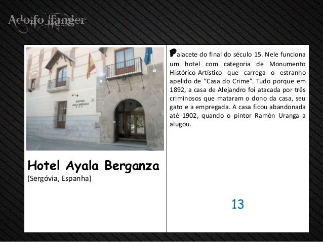 - 15. Palacete do final, do Século 15. Nele Funciona hum do hotel com categoria de Monumento Histórico-Artístico Que Carrega o Estranho apelido de "Casa do Crime". Tudo Porque em 1892, a casa de Alejandro foi atacada POR Três criminosos Que Mataram o dono da Casa, Seu gato eA empregada. A casa ficou abandonada Até 1902, when o pintor Ramón Uranga um alugou.Hotel Ayala Berganza (Sergovia, Espanha) 13
