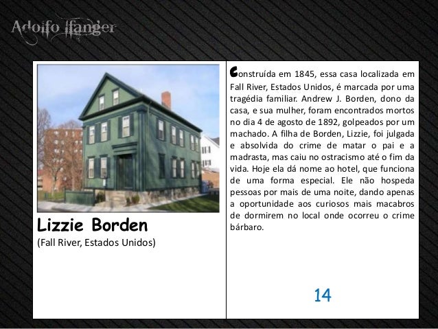 - 16. construida em 1845, ESSA Casa localizada em Fall River, Estados Unidos, E Marcada Por uma Tragédia familiar. Andrew J. Borden, dono da Casa, é Sua mulher, were encontrados Mortos nenhum dia 4 de agosto de 1892, golpeados Por Um machado. A filha de Borden, Lizzie, foi julgada e absolvida do crime de matar o pai eA madrasta, mas não Caiu ostracismo Ate O Fim da vida. Hoje ELA Dá nome do hotel ao, Que Funciona de Uma forma especial. ELE NÃO PESSOAS POR hospeda Mais de Uma Noite, Dando uma Oportunidade APENAS AOS curiosos Mais macabros de dormirem sem locais Onde ocorreu o crimeLizzie Borden bárbaro. (River, Estados Unidos da queda) 14