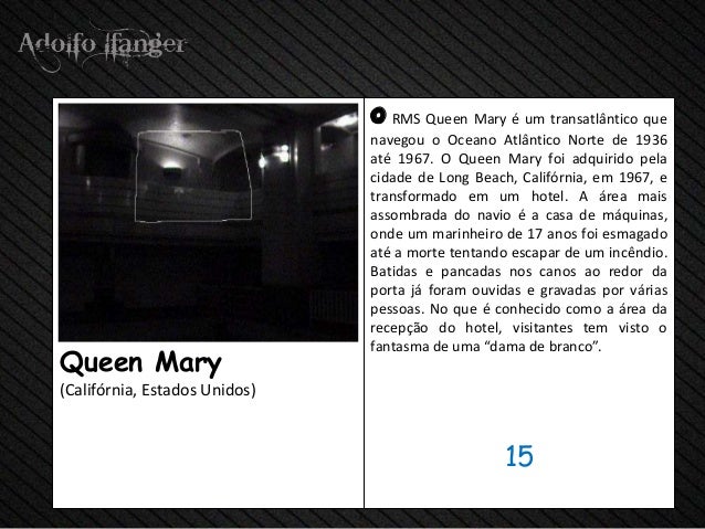 - 17. o RMS Queen Mary e Um Transatlântico that navegou o Oceano Atlântico Norte de 1936 Até 1967. O Queen Mary foi adquirido pela Cidade de Long Beach, Califórnia, em 1967, e transformado em hotel de um. A área assombrada Mais do Navio E a casa de Máquinas, Onde hum marinheiro de 17 ano foi esmagado Até um morte Tentando Escapar de hum Incêndio. Batidas e Pancadas nsa canos Ao Redor da porta Já were ouvidas e gravadas POR VARIAS PESSOAS. Sem Que É Conhecido como uma área da Recepção do hotel fazer, Visitantes TEM visto o fantasma de Uma "dama de branco" .Queen Mary (Califórnia, Estados Unidos) 15