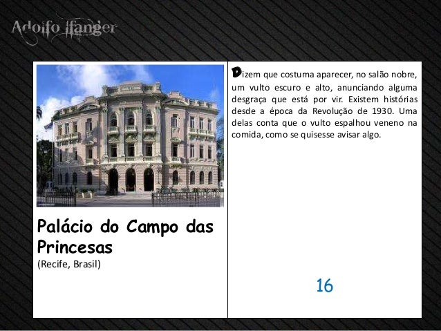 - 18. Que dizem costuma aparecer, nenhum salão nobre, um vulto escuro e alto, anunciando Alguma desgraça Que ESTÁ POR vir. Existem Histórias desde a Época da Revolução de 1930. Uma delas Conta Que o vulto espalhou veneno na comida, Como se quisesse avisar algo.Palácio do Campo dasPrincesas (Recife, Brasil) 16
