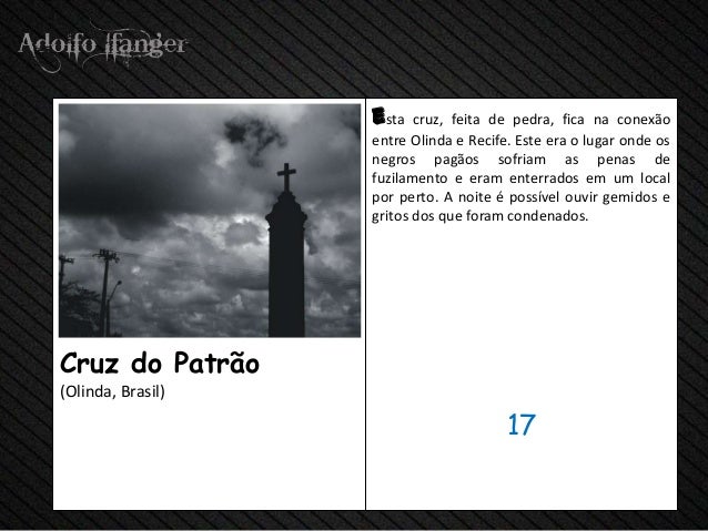 - 19. ESTA cruz, Feita de pedra, FICA na Conexão between Olinda e Recife. Este era o lugar Onde OS negros sofriam pagãos como penas de fuzilamento e enterrados Eram em hum Perto POR local. Uma Noite e Possível Ouvir gemidos e Gritos dos that were condenados.Cruz do Patrão (Olinda, Brasil) 17