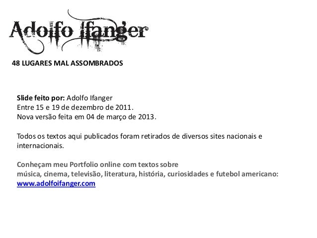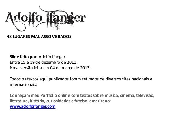 - 2. 48 LUGARES MAL ASSOMBRADOS Deslize Feito por: Adolfo Ifanger Entre 15 e 19 de dezembro de 2011. Nova Versão Feita em 04 de março de 2013. Todos Os Textos publicados were here retirados de Diversos locais Nacionais e Internacionais. Conheçam meu Portfolio Textos COM on-line Sobre música, cinema, Televisão, literatura, História, curiosidades e futebol americano: www.adolfoifanger.com