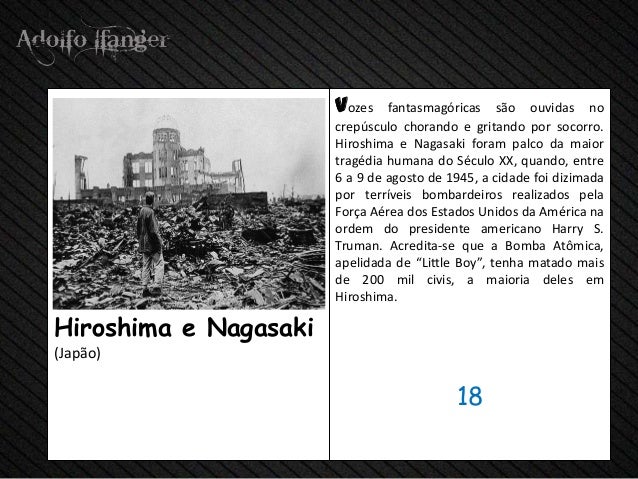 - 20. Vozes fantasmagóricas São ouvidas no crepúsculo Chorando e Gritando POR socorro. Hiroshima e Nagasaki were palco da Maior Tragédia humana do Século XX, Quando, Entre 6 a 9 de agosto de 1945, a Cidade foi dizimada POR terríveis bombardeiros Realizados Pela Força Aérea dos Estados Unidos da América na Ordem do presidente americano Harry S. Truman. Acredita-se Que a Bomba Atômica, apelidada de "Little Boy", tenha matado Mais de 200 mil civis, a maioria DELES em Hiroshima.Hiroshima e Nagasaki (Japão) 18