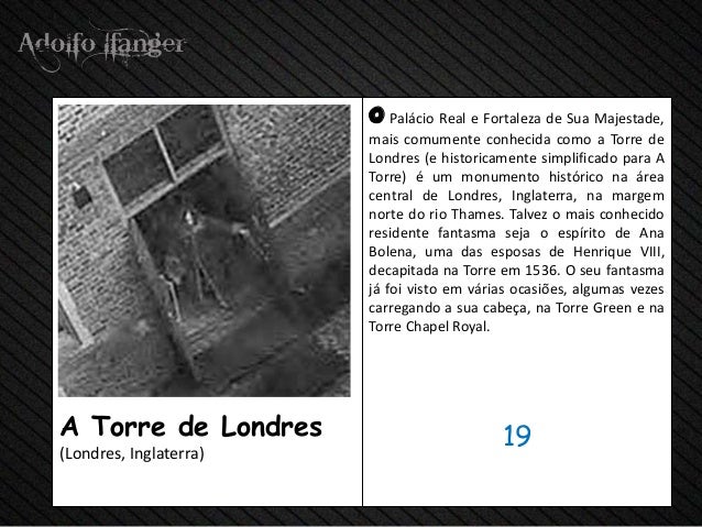 - 21. o Palácio Real e Fortaleza de Sua Majestade, Mais comumente conhecida Como a Torre de Londres (e historicamente simplificado parágrafo A Torre) e Um monumento histórico na área de centro de Londres, Inglaterra, na Margem Norte do rio Tamisa. TALVEZ O Mais conhecido residente fantasma SEJA O Espírito de Ana Bolena, o das esposas de Henrique UMA VIII, decapitada na Torre em 1536. O Seu fantasma Já foi visto em varias ocasiões, algumas vezes Carregando uma SUA Cabeça, na Torre Verde e na Torre Chapel Royal.A Torre de Londres 19 (Londres, Inglaterra)