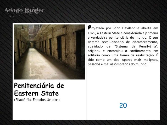 - 22. Projetada POR John Haviland e Aberta em 1829, um Estado-Leste E Considerada A Primeira Verdadeira e Penitenciária do Mundo. O Seu Sistema Revolucionário de encarceramento, apelidado de "Sistema da Pensilvania", originou e encorajou o Confinamento em solitária Como Uma forma de Reabilitação. E Tido Como hum dos Lugares Mais malignos, Pesados e mal assombrados fazer mundo.Penitenciária deEastern Estado (Filadélfia, Estados Unidos) 20