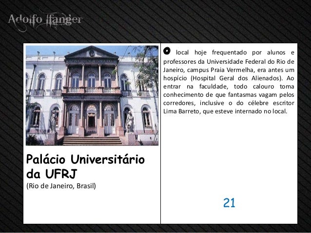 - 23. Hoje o local, frequentado POR Alunos e Professores da Universidade Federal do Rio de Janeiro, campus Praia Vermelha, era pingos hum Hospício (Hospital Geral dos Alienados). Ao Entrar na faculdade, todo calouro toma Conhecimento De que vagam fantasmas Pelos Corredores, inclusive o célebre escritor fazer Lima Barreto, that Esteve internado há local.Palácio Universitárioda UFRJ (Rio de Janeiro, Brasil) 21