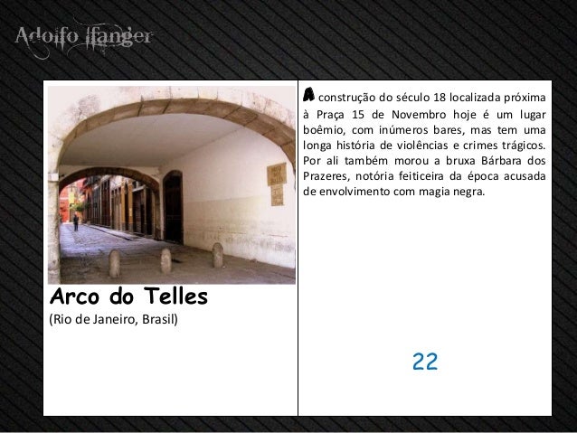 - 24. Construção de um do Século 18 Próxima localizada à Praça 15 de Novembro Hoje é Um Lugar boêmio, com inúmeros bares, o MAS dez Longa História de Violências e trágicos crimes de Uma. Por ali also Morou uma bruxa Bárbara dos Prazeres, Notoria feiticeira da Época acusada de Envolvimento com magia negra.Arco fazer Telles (Rio de Janeiro, Brasil) 22