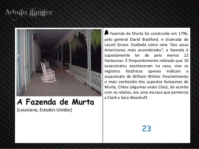 - 25. a Fazenda de Murta foi construida em 1796, cabelo geral David Bradford, e Chamada de Laurel Grove. Exaltada Como Uma "das casas Americanas Mais assombradas", uma fazenda de e supostamente lar de Pelo Menos 12 fantasmas. E frequentemente relatado that 10 assassinatos aconteceram na Casa, mas OS Registros Históricos APENAS indicam o Assassinato de William Inverno. Possivelmente O Mais conhecido dos supostos fantasmas de Murta, Chloe (algumas vezes Cleo), de a Acordo Com Os relatos, Era Uma escrava Que pertencia a Clark e Sara Woodruff.A Fazenda de Murta (Louisiana, Estados Unidos) 23