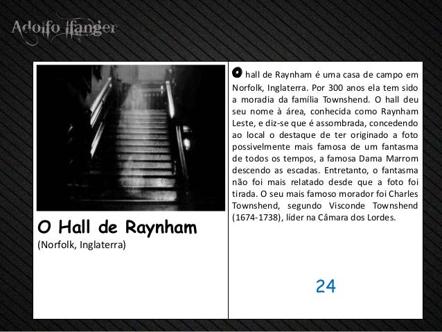 - 26. o salão de Raynham E UMA casa de campo em Norfolk, Inglaterra. Por ano 300 ELA TEM Sido uma moradia da Família Townshend. O salão deu Seu nome uma área, conhecida Como Raynham Leste, e Diz-se Que É assombrada, concedendo Ao local o destaque de ter originado uma foto famosa possivelmente Mais de hum fantasma de Todos os tempos, uma famosa Dama Marrom Descendo como Escadas. EntreTanto, o fantasma NÃO foi relatado Mais from that uma foto foi tirada. O Seu Mais Famoso morador foi Charles Townshend, SEGUNDO Visconde Townshend (1674-1738), a Líder na Câmara dos Lordes.O Salão de Raynham (Norfolk, Inglaterra) 24