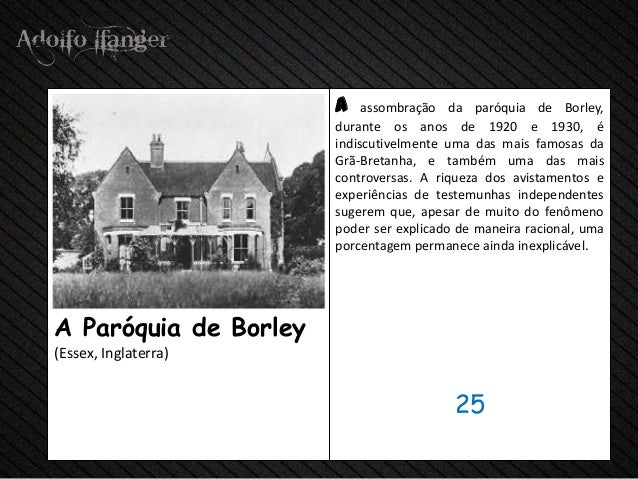 - 27. a assombração da paróquia de Borley, durante os anos de 1920 e 1930, é indiscutivelmente uma das mais famosas da Grã-Bretanha, e também uma das mais controversas. A riqueza dos avistamentos e experiências de testemunhas independentes sugerem que, apesar de muito do fenômeno poder ser explicado de maneira racional, uma porcentagem permanece ainda inexplicável.A Paróquia de Borley(Essex, Inglaterra) 25