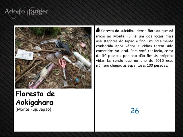 - 28. a floresta do suicídio.densa floresta que dá início ao Monte Fuji é um dos locais mais assustadores do Japão e ficou mundialmente conhecida após vários suicídios terem sido cometidos no local. Para você ter ideia, cerca de 30 pessoas por ano dão fim às próprias vidas lá, sendo que no ano de 2010 esse número chegou às espantosas 100 pessoas.Floresta deAokigahara(Monte Fuji, Japão) 26