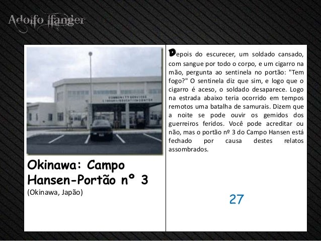 - 29. depois do escurecer, um soldado cansado, com sangue por todo o corpo, e um cigarro na mão, pergunta ao sentinela no portão: "Tem fogo?" O sentinela diz que sim, e logo que o cigarro é aceso, o soldado desaparece. Logo na estrada abaixo teria ocorrido em tempos remotos uma batalha de samurais. Dizem que a noite se pode ouvir os gemidos dos guerreiros feridos. Você pode acreditar ou não, mas o portão nº 3 do Campo Hansen está fechado por causa destes relatos assombrados.Okinawa: CampoHansen-Portão nº 3(Okinawa, Japão) 27