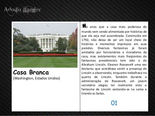 - 3. há anos Que a casa Mais poderosa do Mundo VEM Sendo alimentada POR Histórias de that ELA SEJA mal assombrada. Construida em 1792, Não Deixa de Ser hum locais Cheio de Histórias e momentos Impressos em SUAS paredes. Diversos fantasmas Já were avistados POR Funcionários e moradores da Casa, mas avistamentos Mais Freqüentes de fantasmas presidenciais TEM Sido o de Abraham Lincoln. Eleanor Roosevelt declarou Uma Vez Que acreditava Sentir uma Presença deCasa Branca Lincoln um Observando, enquanto trabalhava no (Washington, Estados Unidos) Quarto de Lincoln. Tambem Durante uma Administração de Roosevelt, um Jovem Secretário alegou ter visto o fantasma Realmente de Lincoln sentando-se na cama e tirando as botas. 01