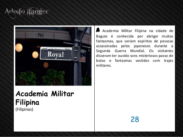 - 30. a Academia Militar Filipina na cidade de Baguio é conhecida por abrigar muitos fantasmas, que seriam espíritos de pessoas assassinadas pelos japoneses durante a Segunda Guerra Mundial. Os visitantes disseram ter ouvido sons misteriosos passo de botas e fantasmas vestidos com trajes militares.Academia MilitarFilipina(Filipinas) 28