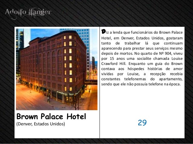 - 31. diz a lenda que funcionários do Brown Palace Hotel, em Denver, Estados Unidos, gostaram tanto de trabalhar lá que continuam aparecendo para prestar seus serviços mesmo depois de mortos. No quarto de Nº 904, viveu por 15 anos uma socialite chamada Louise Crawford Hill. Enquanto um guia do Brown contava aos hóspedes histórias de amor vividas por Louise, a recepção recebia constantes telefonemas do apartamento, sendo que ele não possuía telefone na época.Brown Palace Hotel(Denver, Estados Unidos) 29