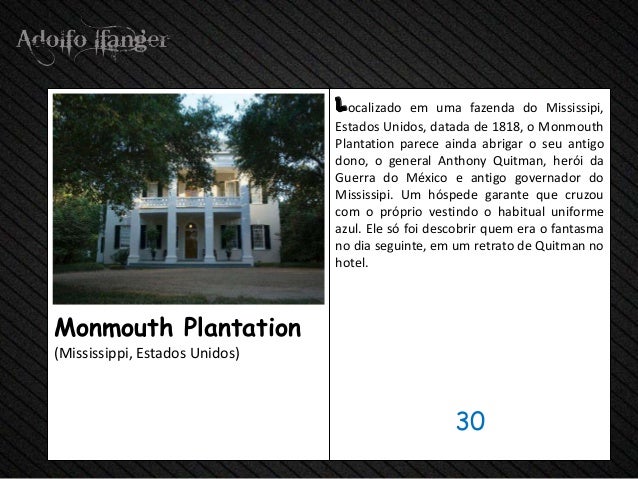 - 32. localizado em uma fazenda do Mississipi, Estados Unidos, datada de 1818, o Monmouth Plantation parece ainda abrigar o seu antigo dono, o general Anthony Quitman, herói da Guerra do México e antigo governador do Mississipi. Um hóspede garante que cruzou com o próprio vestindo o habitual uniforme azul. Ele só foi descobrir quem era o fantasma no dia seguinte, em um retrato de Quitman no hotel.Monmouth Plantation(Mississippi, Estados Unidos) 30