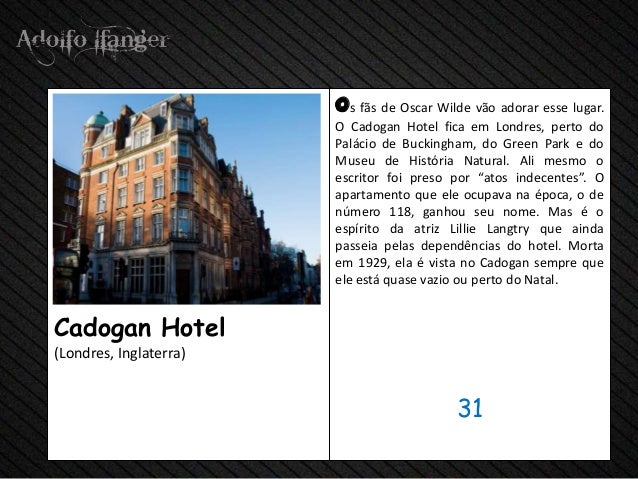 - 33. os fãs de Oscar Wilde vão adorar esse lugar. O Cadogan Hotel fica em Londres, perto do Palácio de Buckingham, do Green Park e do Museu de História Natural. Ali mesmo o escritor foi preso por “atos indecentes”. O apartamento que ele ocupava na época, o de número 118, ganhou seu nome. Mas é o espírito da atriz Lillie Langtry que ainda passeia pelas dependências do hotel. Morta em 1929, ela é vista no Cadogan sempre que ele está quase vazio ou perto do Natal.Cadogan Hotel(Londres, Inglaterra) 31