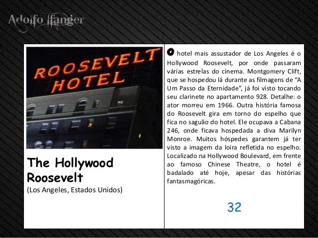 - 34. o hotel mais assustador de Los Angeles é o Hollywood Roosevelt, por onde passaram várias estrelas do cinema. Montgomery Clift, que se hospedou lá durante as filmagens de “A Um Passo da Eternidade”, já foi visto tocando seu clarinete no apartamento 928. Detalhe: o ator morreu em 1966. Outra história famosa do Roosevelt gira em torno do espelho que fica no saguão do hotel. Ele ocupava a Cabana 246, onde ficava hospedada a diva Marilyn Monroe. Muitos hóspedes garantem já ter visto a imagem da loira refletida no espelho. Localizado na Hollywood Boulevard, em frenteThe Hollywood ao famoso Chinese Theatre, o hotel éRoosevelt badalado até hoje, apesar das histórias fantasmagóricas.(Los Angeles, Estados Unidos) 32