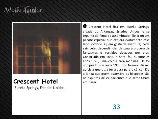 - 35. o Crescent Hotel fica em Eureka Springs, cidade do Arkansas, Estados Unidos, e se orgulha da fama de assombrado. Ele criou um pacote especial que explora exatamente esse lado sombrio. Quem gosta de aventura, pode sair pelas dependências da casa à procura de fantasmas e vestígios deixados por eles. Construído em 1886, o hotel foi, durante os anos 1920, uma escola para meninas. Ele foi comprado nos anos 1930 por Norman Baker, golpista que dizia ter a cura para o câncer. Diz a lenda que quem assombra os hóspedes são os espíritos de ex-pacientes que acreditaramCrescent Hotel em Baker.(Eureka Springs, Estados Unidos) 33