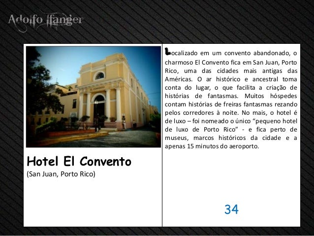 - 36. localizado em um convento abandonado, o charmoso El Convento fica em San Juan, Porto Rico, uma das cidades mais antigas das Américas. O ar histórico e ancestral toma conta do lugar, o que facilita a criação de histórias de fantasmas. Muitos hóspedes contam histórias de freiras fantasmas rezando pelos corredores à noite. No mais, o hotel é de luxo – foi nomeado o único “pequeno hotel de luxo de Porto Rico” - e fica perto de museus, marcos históricos da cidade e a apenas 15 minutos do aeroporto.Hotel El Convento(San Juan, Porto Rico) 34