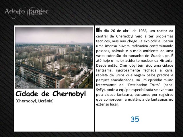 - 37. no dia 26 de abril de 1986, um reator da central de Chernobyl veio a ter problemas tecnicos, mas nao chegou a explodir e liberou uma imensa nuvem radioativa contaminando pessoas, animais e o meio ambiente de uma vasta extensão do tamanho de Guadalupe. É até hoje o maior acidente nuclear da História. Desde então, Chernobyl tem sido uma cidade fantasma, rigorosamente fechada a civis, repleta de ursos que vagam pelos prédios e parques abandonados. Há um episódio muito interessante de “Destination Truth” (canal SyFy), onde a equipe especializada se aventuraCidade de Chernobyl pela cidade fantasma, buscando por registros(Chernobyl, Ucrânia) que comprovem a existência de fantasmas no extenso local. 35