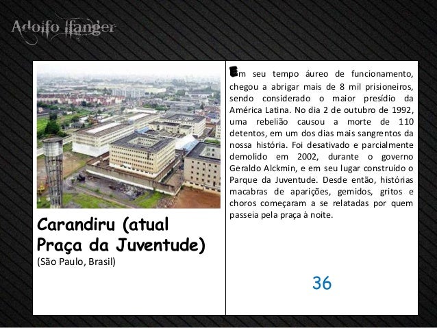 - 38. em seu tempo áureo de funcionamento, chegou a abrigar mais de 8 mil prisioneiros, sendo considerado o maior presídio da América Latina. No dia 2 de outubro de 1992, uma rebelião causou a morte de 110 detentos, em um dos dias mais sangrentos da nossa história. Foi desativado e parcialmente demolido em 2002, durante o governo Geraldo Alckmin, e em seu lugar construído o Parque da Juventude. Desde então, histórias macabras de aparições, gemidos, gritos e choros começaram a se relatadas por quem passeia pela praça à noite.Carandiru (atualPraça da Juventude)(São Paulo, Brasil) 36
