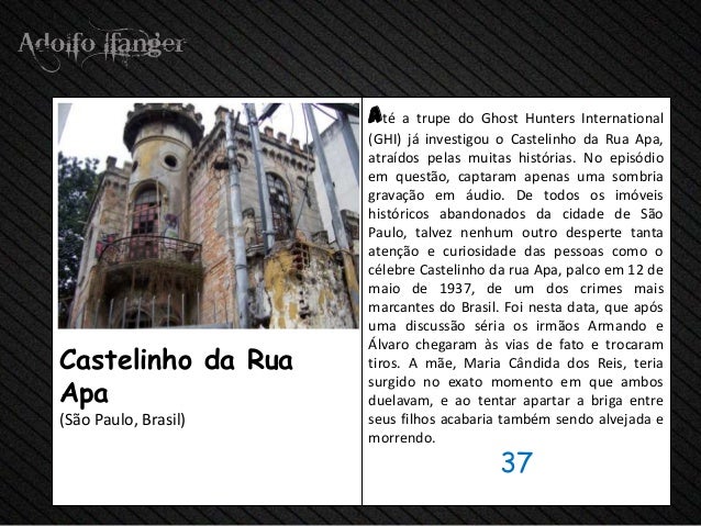 - 39. até a trupe do Ghost Hunters International (GHI) já investigou o Castelinho da Rua Apa, atraídos pelas muitas histórias. No episódio em questão, captaram apenas uma sombria gravação em áudio. De todos os imóveis históricos abandonados da cidade de São Paulo, talvez nenhum outro desperte tanta atenção e curiosidade das pessoas como o célebre Castelinho da rua Apa, palco em 12 de maio de 1937, de um dos crimes mais marcantes do Brasil. Foi nesta data, que após uma discussão séria os irmãos Armando e Álvaro chegaram às vias de fato e trocaramCastelinho da Rua tiros. A mãe, Maria Cândida dos Reis, teriaApa surgido no exato momento em que ambos duelavam, e ao tentar apartar a briga entre(São Paulo, Brasil) seus filhos acabaria também sendo alvejada e morrendo. 37