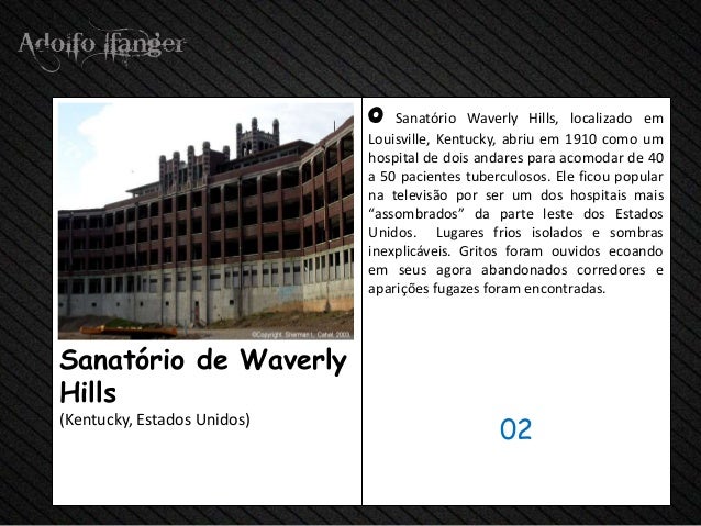 - 4. o Sanatório Waverly Hills, LOCALIZADO em Louisville, Kentucky, abriu EM 1910 Como hum hospitalares de Dois Andares parágrafo acomodar de 40 a 50 patients tuberculosos. He ficou populares na Televisão por Ser hum dos hospitais mais "assombrados" da parte leste dos Estados Unidos. Lugares Frios Isolados e sombras inexplicáveis. Gritos were Ouvidos Ecoando EM SEUS ágora Abandonados Corredores e Aparições fugazes were encontradas.Sanatório de WaverlyHills 02 (Kentucky, Estados Unidos)