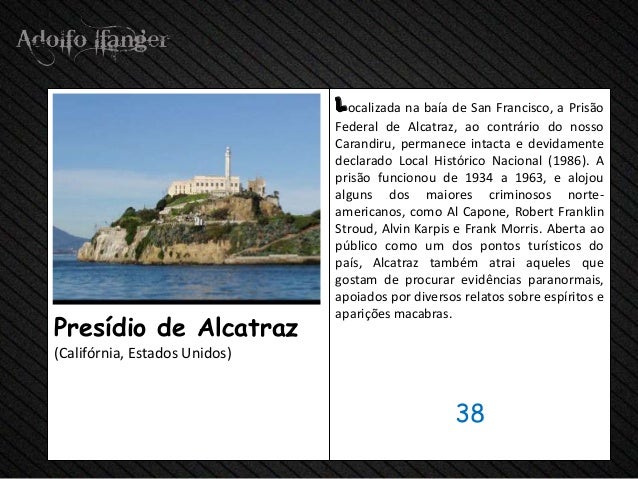 - 40. localizada na baía de San Francisco, a Prisão Federal de Alcatraz, ao contrário do nosso Carandiru, permanece intacta e devidamente declarado Local Histórico Nacional (1986). A prisão funcionou de 1934 a 1963, e alojou alguns dos maiores criminosos norte- americanos, como Al Capone, Robert Franklin Stroud, Alvin Karpis e Frank Morris. Aberta ao público como um dos pontos turísticos do país, Alcatraz também atrai aqueles que gostam de procurar evidências paranormais, apoiados por diversos relatos sobre espíritos e aparições macabras.Presídio de Alcatraz(Califórnia, Estados Unidos) 38