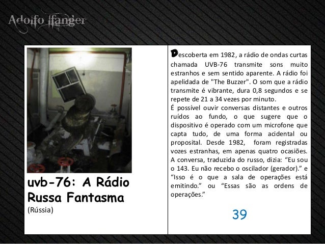 - 41. descoberta em 1982, a rádio de ondas curtas chamada UVB-76 transmite sons muito estranhos e sem sentido aparente. A rádio foi apelidada de "The Buzzer". O som que a rádio transmite é vibrante, dura 0,8 segundos e se repete de 21 a 34 vezes por minuto. É possível ouvir conversas distantes e outros ruídos ao fundo, o que sugere que o dispositivo é operado com um microfone que capta tudo, de uma forma acidental ou proposital. Desde 1982, foram registradas vozes estranhas, em apenas quatro ocasiões. A conversa, traduzida do russo, dizia: “Eu sou o 143. Eu não recebo o oscilador (gerador).” euvb-76: A Rádio “Isso é o que a sala de operações está emitindo.” ou “Essas são as ordens deRussa Fantasma operações.” 39(Rússia)