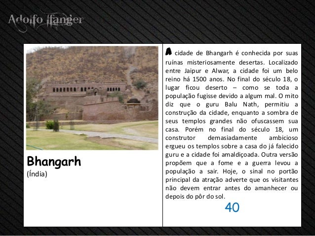 - 42. a cidade de Bhangarh é conhecida por suas ruínas misteriosamente desertas. Localizado entre Jaipur e Alwar, a cidade foi um belo reino há 1500 anos. No final do século 18, o lugar ficou deserto – como se toda a população fugisse devido a algum mal. O mito diz que o guru Balu Nath, permitiu a construção da cidade, enquanto a sombra de seus templos grandes não ofuscassem sua casa. Porém no final do século 18, um construtor demasiadamente ambicioso ergueu os templos sobre a casa do já falecido guru e a cidade foi amaldiçoada. Outra versãoBhangarh propõem que a fome e a guerra levou a(Índia) população a sair. Hoje, o sinal no portão principal da atração adverte que os visitantes não devem entrar antes do amanhecer ou depois do pôr do sol. 40