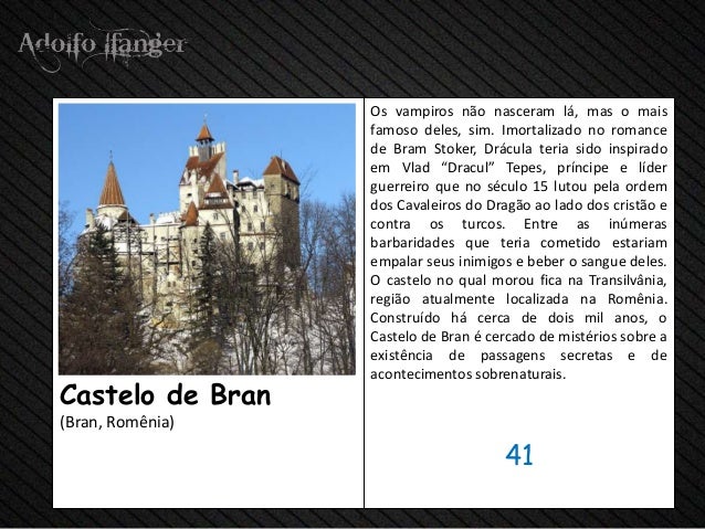 - 43. Os vampiros não nasceram lá, mas o mais famoso deles, sim. Imortalizado no romance de Bram Stoker, Drácula teria sido inspirado em Vlad “Dracul” Tepes, príncipe e líder guerreiro que no século 15 lutou pela ordem dos Cavaleiros do Dragão ao lado dos cristão e contra os turcos. Entre as inúmeras barbaridades que teria cometido estariam empalar seus inimigos e beber o sangue deles. O castelo no qual morou fica na Transilvânia, região atualmente localizada na Romênia. Construído há cerca de dois mil anos, o Castelo de Bran é cercado de mistérios sobre a existência de passagens secretas e de acontecimentos sobrenaturais.Castelo de Bran(Bran, Romênia) 41
