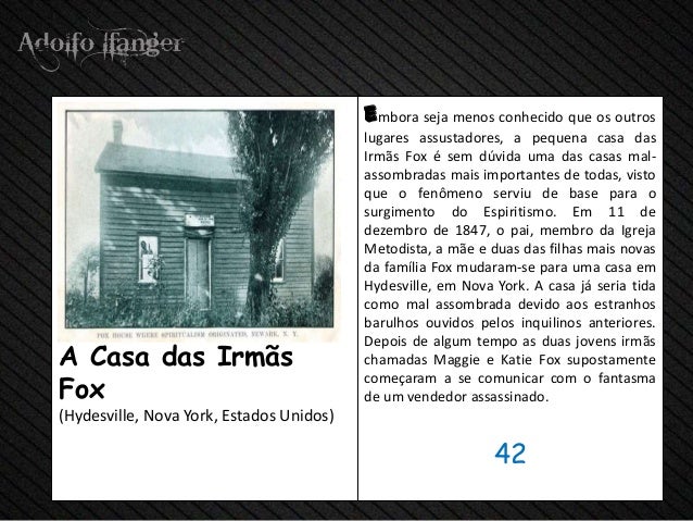- 44. embora seja menos conhecido que os outros lugares assustadores, a pequena casa das Irmãs Fox é sem dúvida uma das casas mal- assombradas mais importantes de todas, visto que o fenômeno serviu de base para o surgimento do Espiritismo. Em 11 de dezembro de 1847, o pai, membro da Igreja Metodista, a mãe e duas das filhas mais novas da família Fox mudaram-se para uma casa em Hydesville, em Nova York. A casa já seria tida como mal assombrada devido aos estranhos barulhos ouvidos pelos inquilinos anteriores. Depois de algum tempo as duas jovens irmãsA Casa das Irmãs chamadas Maggie e Katie Fox supostamenteFox começaram a se comunicar com o fantasma de um vendedor assassinado.(Hydesville, Nova York, Estados Unidos) 42