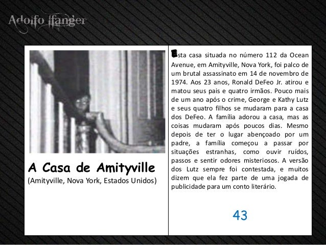 - 45. esta casa situada no número 112 da Ocean Avenue, em Amityville, Nova York, foi palco de um brutal assassinato em 14 de novembro de 1974. Aos 23 anos, Ronald DeFeo Jr. atirou e matou seus pais e quatro irmãos. Pouco mais de um ano após o crime, George e Kathy Lutz e seus quatro filhos se mudaram para a casa dos DeFeo. A família adorou a casa, mas as coisas mudaram após poucos dias. Mesmo depois de ter o lugar abençoado por um padre, a família começou a passar por situações estranhas, como ouvir ruídos, passos e sentir odores misteriosos. A versãoA Casa de Amityville dos Lutz sempre foi contestada, e muitos(Amityville, Nova York, Estados Unidos) dizem que ela fez parte de uma jogada de publicidade para um conto literário. 43