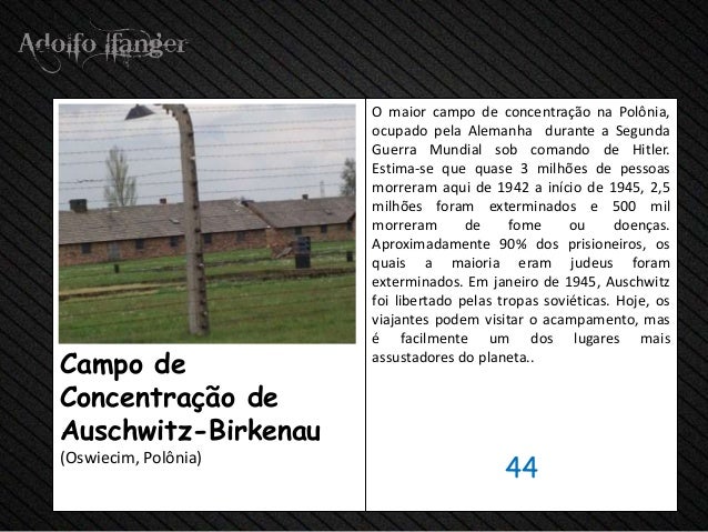 - 46. O maior campo de concentração na Polônia, ocupado pela Alemanha durante a Segunda Guerra Mundial sob comando de Hitler. Estima-se que quase 3 milhões de pessoas morreram aqui de 1942 a início de 1945, 2,5 milhões foram exterminados e 500 mil morreram de fome ou doenças. Aproximadamente 90% dos prisioneiros, os quais a maioria eram judeus foram exterminados. Em janeiro de 1945, Auschwitz foi libertado pelas tropas soviéticas. Hoje, os viajantes podem visitar o acampamento, mas é facilmente um dos lugares maisCampo de assustadores do planeta..Concentração deAuschwitz-Birkenau 44(Oswiecim, Polônia)