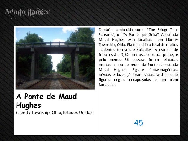 - 47. Também conhecida como “The Bridge That Screams”, ou “A Ponte que Grita”. A estrada Maud Hughes está localizada em Liberty Township, Ohio. Ela tem sido o local de muitos acidentes terríveis e suicídios. A estrada de ferro está a 7,62 metros abaixo da ponte, e pelo menos 36 pessoas foram relatadas mortas na ou ao redor da Ponte da estrada Maud Hughes. Figuras fantasmagóricas, névoas e luzes já foram vistas, assim como figuras negras encapuzadas e um trem fantasma.A Ponte de MaudHughes(Liberty Township, Ohio, Estados Unidos) 45
