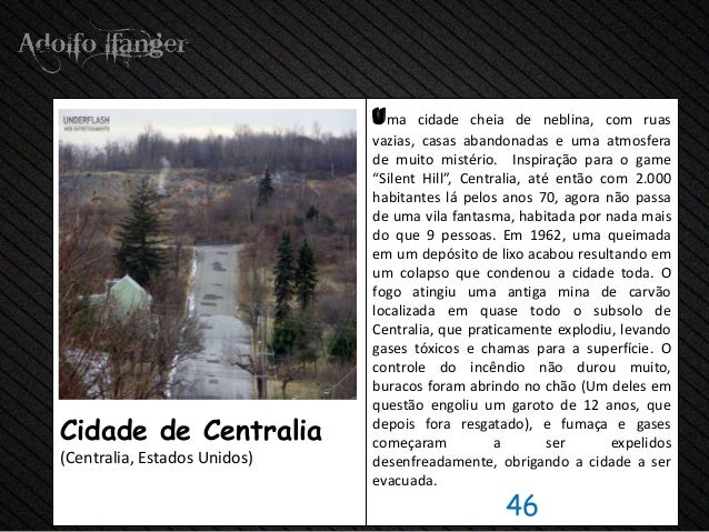 - 48. uma cidade cheia de neblina, com ruas vazias, casas abandonadas e uma atmosfera de muito mistério. Inspiração para o game “Silent Hill”, Centralia, até então com 2.000 habitantes lá pelos anos 70, agora não passa de uma vila fantasma, habitada por nada mais do que 9 pessoas. Em 1962, uma queimada em um depósito de lixo acabou resultando em um colapso que condenou a cidade toda. O fogo atingiu uma antiga mina de carvão localizada em quase todo o subsolo de Centralia, que praticamente explodiu, levando gases tóxicos e chamas para a superfície. O controle do incêndio não durou muito, buracos foram abrindo no chão (Um deles em questão engoliu um garoto de 12 anos, queCidade de Centralia depois fora resgatado), e fumaça e gases começaram a ser expelidos(Centralia, Estados Unidos) desenfreadamente, obrigando a cidade a ser evacuada. 46