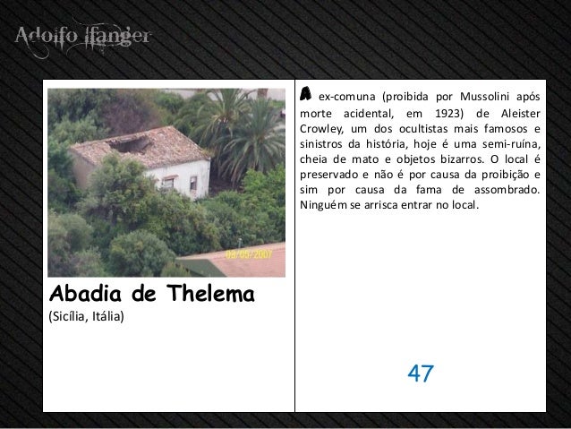 - 49. a ex-comuna (proibida por Mussolini após morte acidental, em 1923) de Aleister Crowley, um dos ocultistas mais famosos e sinistros da história, hoje é uma semi-ruína, cheia de mato e objetos bizarros. O local é preservado e não é por causa da proibição e sim por causa da fama de assombrado. Ninguém se arrisca entrar no local.Abadia de Thelema(Sicília, Itália) 47