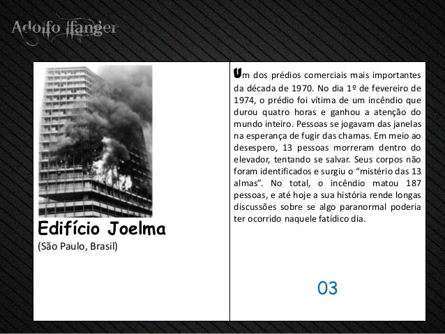 - 5. hum dos predios Comerciais Mais IMPORTANTES da Década de 1970. No dia 1º de fevereiro de 1974, o Prédio foi Vítima de hum Incêndio Que Durou Quatro horas e ganhou um Atenção do Mundo Inteiro. PESSOAS se jogavam das Janelas na Esperança de Fugir das chamas. Em Meio Ao Desespero, 13 PESSOAS morreram Dentro do Elevador, Tentando se salvar. SEUS Corpos Não foram identificados e surgiu o "Mistério das 13 Almas". No total, a Incêndio o matou 187 PESSOAS, e Até Hoje a SUA História rende Longas DISCUSSÕES Sobre se algo paranormal poderia ter ocorrido naquele fatídico dia.Edifício Joelma (São Paulo, Brasil) 03