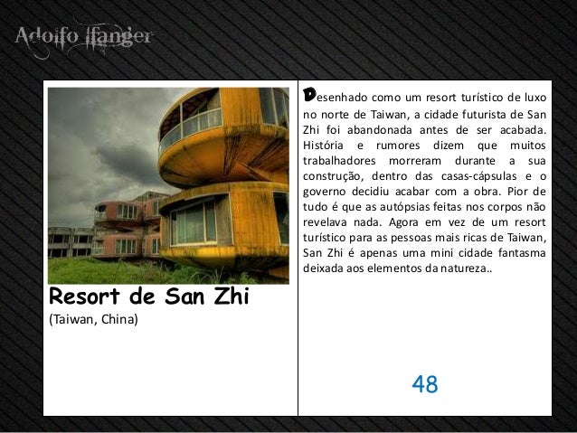 - 50. desenhado como um resort turístico de luxo no norte de Taiwan, a cidade futurista de San Zhi foi abandonada antes de ser acabada. História e rumores dizem que muitos trabalhadores morreram durante a sua construção, dentro das casas-cápsulas e o governo decidiu acabar com a obra. Pior de tudo é que as autópsias feitas nos corpos não revelava nada. Agora em vez de um resort turístico para as pessoas mais ricas de Taiwan, San Zhi é apenas uma mini cidade fantasma deixada aos elementos da natureza..Resort de San Zhi(Taiwan, China) 48