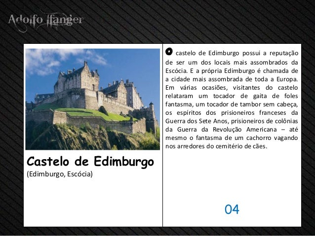 - 6. O Castelo de Edimburgo POSSUI uma Reputação de Ser hum dos LOCAIS Mais assombrados da Escócia. E um Própria Edimburgo E Chamada de A Cidade Mais assombrada De toda a Europa. Em varias ocasiões, Visitantes do castelo relataram hum tocador de gaita de foles fantasma, um tocador de tambor sem Cabeça, OS espíritos dos prisioneiros Franceses da Guerra dos Sete Anos, prisioneiros de colônias da Guerra da Revolução Americana - Até MESMO o fantasma de hum cachorro Arredores vagando nsa do Cemitério de cães.Castelo de Edimburgo (Edimburgo, Escócia) 04