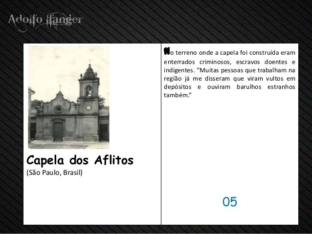 - 7. Onde há terreno a capela foi construida enterrados Eram criminosos, Escravos Doentes e indigentes. "MUITAS PESSOAS Que trabalham na Região Já me disseram Que viram Vultos em Depósitos e ouviram barulhos Estranhos also." Capela dos Aflitos (São Paulo, Brasil) 05