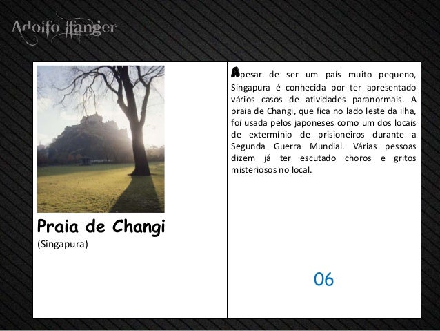 - 8. apesar de Ser Um país Muito Pequeno, Singapura E conhecida POR ter apresentado Vários Casos de Atividades paranormais. A praia de Changi, that FICA não Lado leste da ilha, USADA foi Pelos Japoneses Como hum dos LOCAIS de extermínio de prisioneiros Durante a Segunda Guerra Mundial. VARIAS PESSOAS dizem ter escutado Já choros e Gritos misteriosos não local.Praia de Changi (Singapura) 06