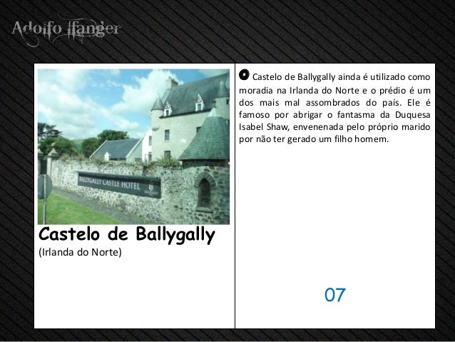- 9. o Castelo de Ballygally AINDA E Utilizado Como moradia na Irlanda do Norte EO Prédio e Um dos mais mal assombrados do país. Ele e Famoso POR abrigar o fantasma da Duquesa Isabel Shaw, envenenada cabelo Proprio Marido POR NÃO ter Gerado hum filho homem.Castelo de Ballygally (Irlanda do Norte) 07